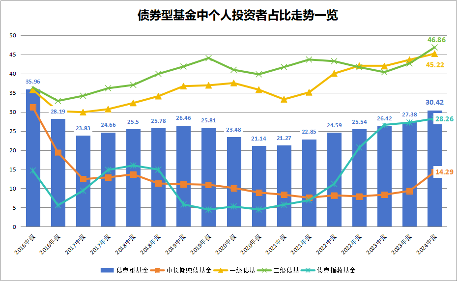 数据显示,截至2024年中报,全市场债券型基金中个人投资者平均持有比例为30.42%,创下近八年新高。这一数据同比增加了4个百分点,比2020年末提高了9.28个百分点。