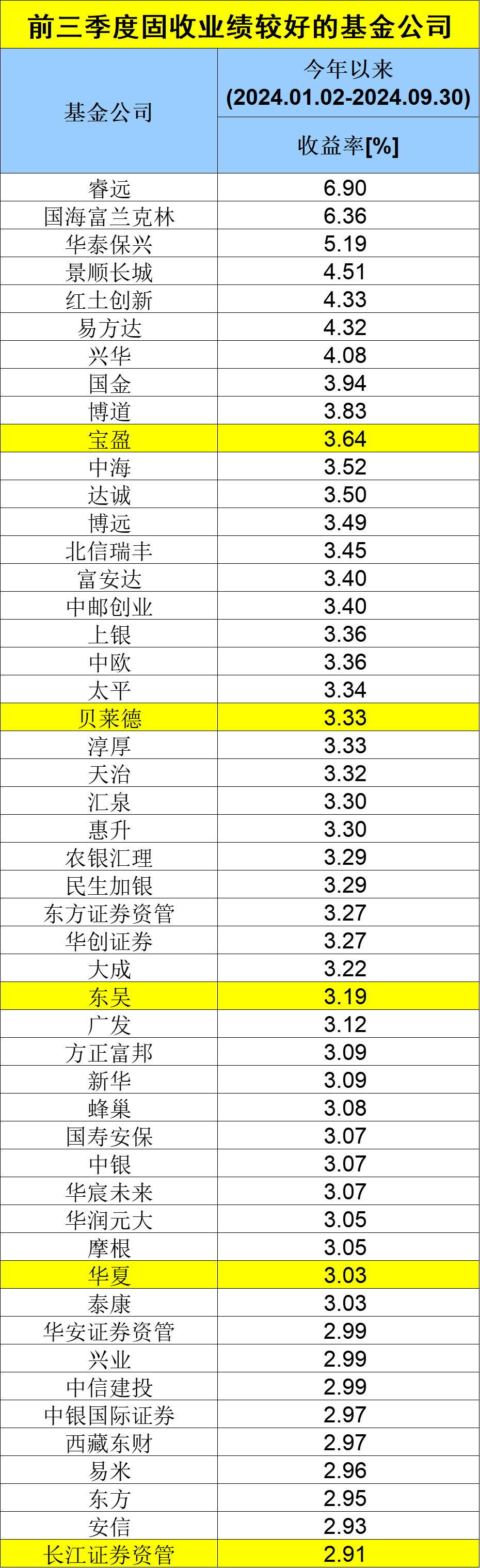 数据显示,41家基金管理人前三季度净值增长率超3%,收益表现较好。睿远今年前三季度固定收益领域收益达到6.9%,位居第一;国海富兰克林期间收益率也超过6%,达到6.36%。此外,华泰保兴、景顺长城、红土创新、易方达、兴华在前三季度也获得超过4%的收益。