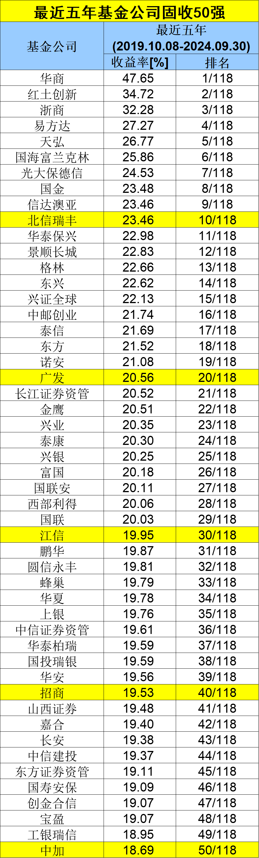 数据显示,在固收类基金最近五年(2019年10月8日至2024年9月30日)净值增长排行中,华商基金在118家可比公司中表现最为优异,净值增长率达47.65%。