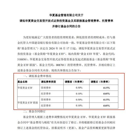 【导读】黄金ETF华夏及其联接基金宣布降费中国基金报记者 张玲继创业板100ETF、中证科创创业50ETF、上证科创板100ETF后,华夏基金旗下又一只ETF及其联接基金宣布降费,同时,管理费率和托管费率均降至目前行业最低水平。黄金ETF华夏及其联接基金宣布降费10月16日,华夏基金发布公告称,为更好地满足广大投资者的投资理财需求,降低投资者的理财成本,经与基金托管人中国建设银行协商一致,华夏基金决定自2024年10月17日起,调低黄金ETF华夏及其联接基金的管理费率、托管费率,并相应修订基金合同有关内容。根据公告,黄金ETF华夏及其联接基金的管理费率均由0.5%下调至0.15%,托管费率均由0.1%下调至0.05%,下调幅度分别为70%、50%。
