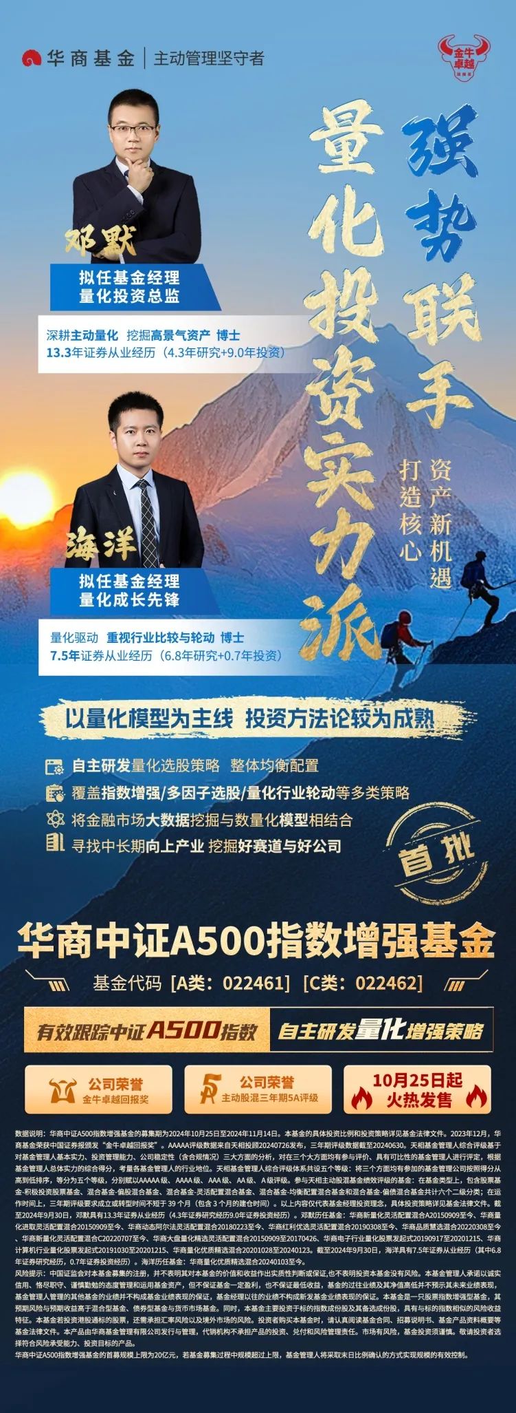 风险提示:华商中证A500指数增强型证券投资基金是一只股票指数增强型基金,其预期风险与预期收益高于混合型基金、债券型基金与货币市场基金。同时,本基金主要投资于标的指数成份股及其备选成份股,具有与标的指数相似的风险收益特征。本基金管理人承诺以诚实信用、恪尽职守、谨慎勤勉的态度管理和运用基金资产,但不保证基金一定盈利,也不保证最低收益,基金的过往业绩及其净值高低并不预示其未来业绩表现,基金管理人管理的其他基金的业绩并不构成基金业绩表现的保证。投资者购买基金时,请认真阅读基金合同、招募说明书、基金产品资料概要等基金法律文件。以上内容仅代表基金经理投资理念,具体投资策略详见基金法律文件。以上内容不代表投资建议,市场有风险,基金投资需谨慎。敬请投资者选择符合风险承受能力、投资目标的产品。