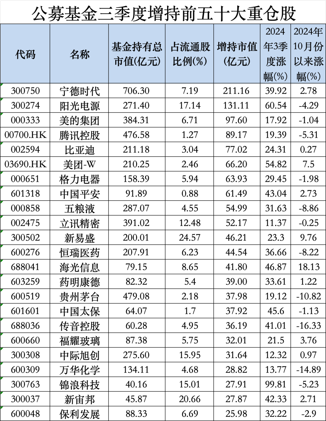 天相投顾数据显示,截至今年三季度末,纳入统计的5142只积极投资偏股型基金的前十大重仓股分别为:宁德时代、贵州茅台、腾讯控股、立讯精密、美的集团、五粮液(000858)、紫金矿业、中际旭创(300308)、阳光电源、比亚迪(002594)。