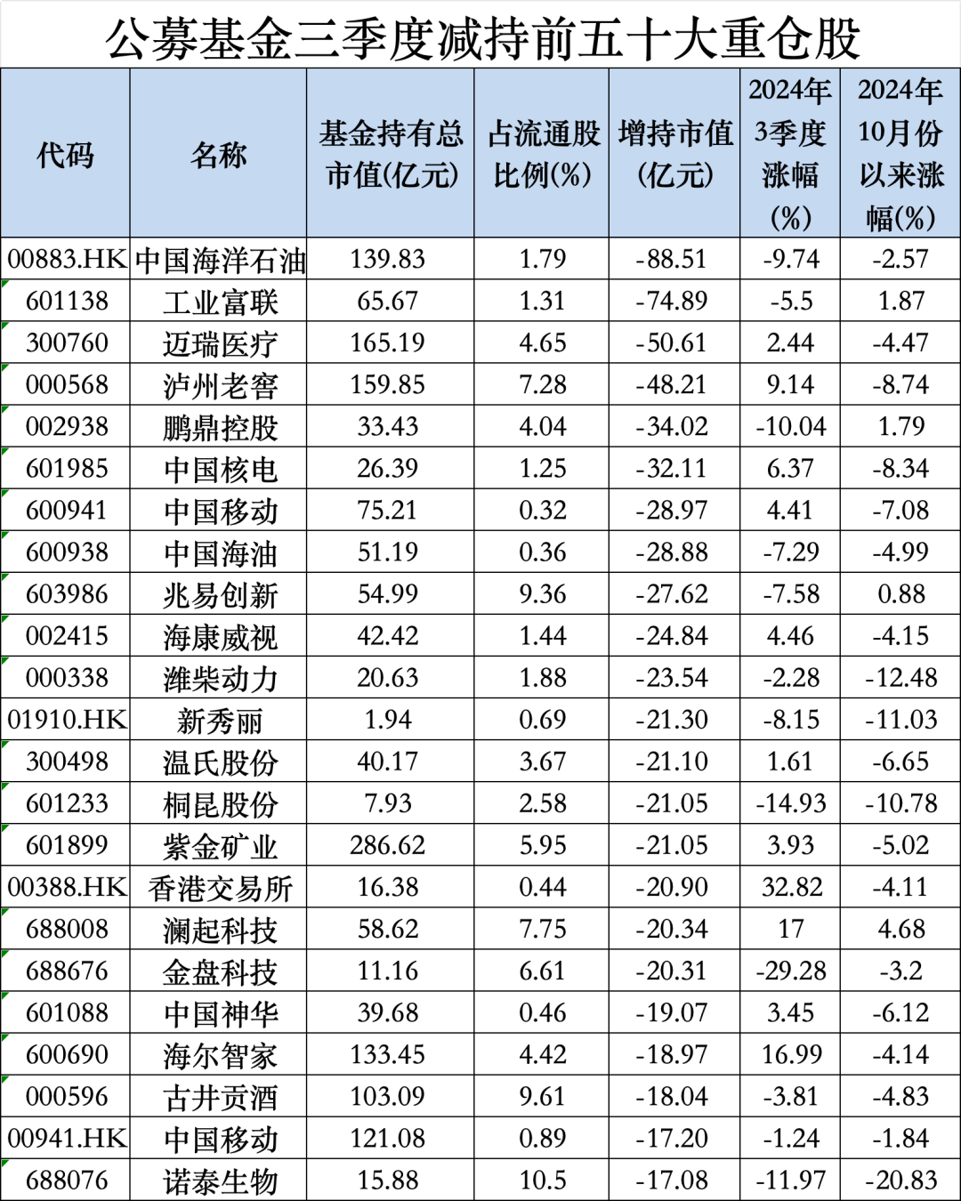 中国海洋石油、工业富联、迈瑞医疗、泸州老窖(000568)、鹏鼎控股(002938)、中国核电(601985)、中国移动(600941)、中国海油(600938)、兆易创新(603986)、海康威视(002415)成为公募基金三季度减持力度最大的十只个股。