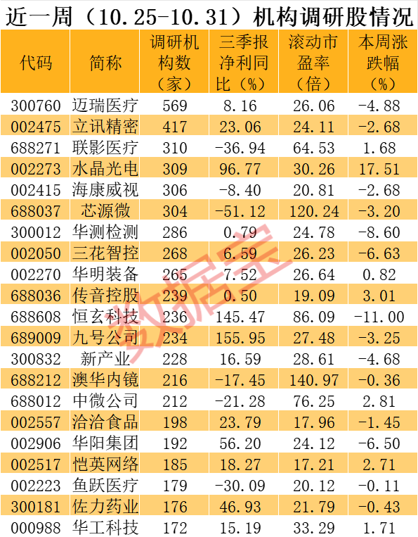 近一周机构调研个股数量有580多只,迈瑞医疗(300760)成为调研机构数量最多的股票。