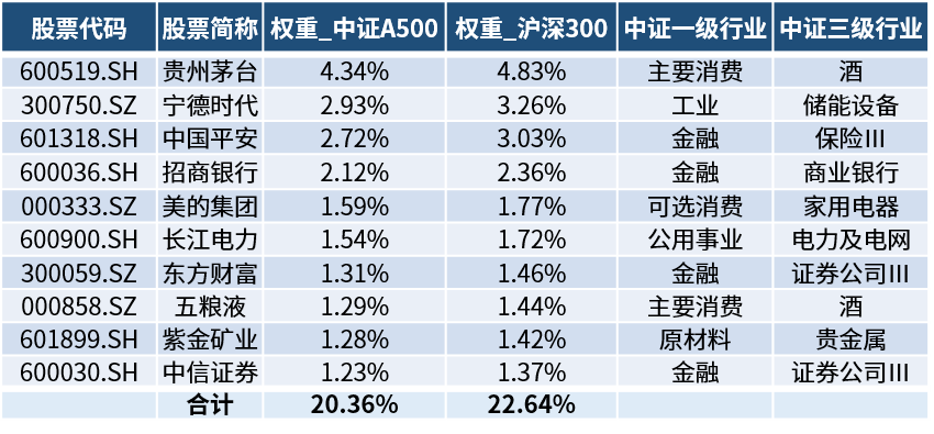 中证A500指数成分股分散配置于细分行业的龙头股,优先选取中证三级行业龙头公司,可更早纳入部分新兴领域龙头公司,增强对新质生产力的代表性。从指数前十大权重股来看,中证A500指数涵盖了多个中证三级细分行业的龙头股,截至2024年11月1日,中证A500指数与沪深300指数前十大权重股完全重合,但中证A500指数的个股权重均更低,个股上分散配置于细分行业的龙头股。