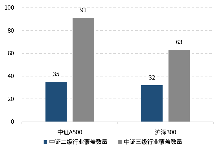 从中证行业覆盖度来看,截至2024年11月1日,中证A500指数覆盖了全部35个中证二级行业以及91个中证三级行业,相对沪深300等指数有更高的细分行业覆盖度。
