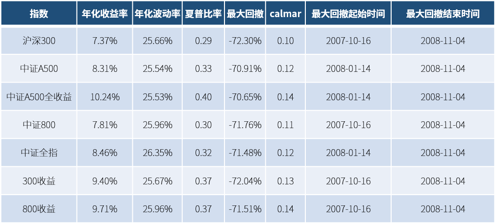 中证A500自指数基期以来,截至2024年11月1日,指数长期年化收益率为8.31%,年化波动率为25.54%,最大回撤为70.91%。此外成分股的分红每年贡献了2%左右的超额收益,全收益指数年化收益10.24%。中证A500指数通过优选细分行业龙头以及行业均衡的编制方式,使得其可以通过更少的样本数量贴近中证全指的表现,且波动和回撤更小,适合长期作为底仓配置 ;另一方面,指数的长期收益也优于沪深300、中证800等同类可比指数,同时波动率和回撤更小。