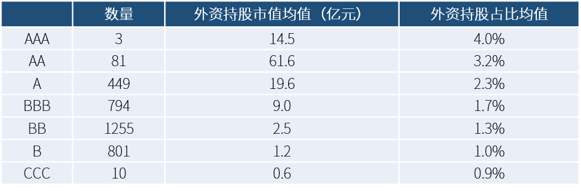 从截至今年三季度的外资持股情况来看,外资更加偏好ESG评级高的上市公司,这在持股市值和持股占比上都有体现。持股市值维度,SG评级为AA级的上市公司的外资持股市值均值为61.6亿元,而CCC级的外资持股市值均值仅为0.6亿元。持股占比维度,随着ESG评级的下降,外资持股市值占比均值也逐级下降。