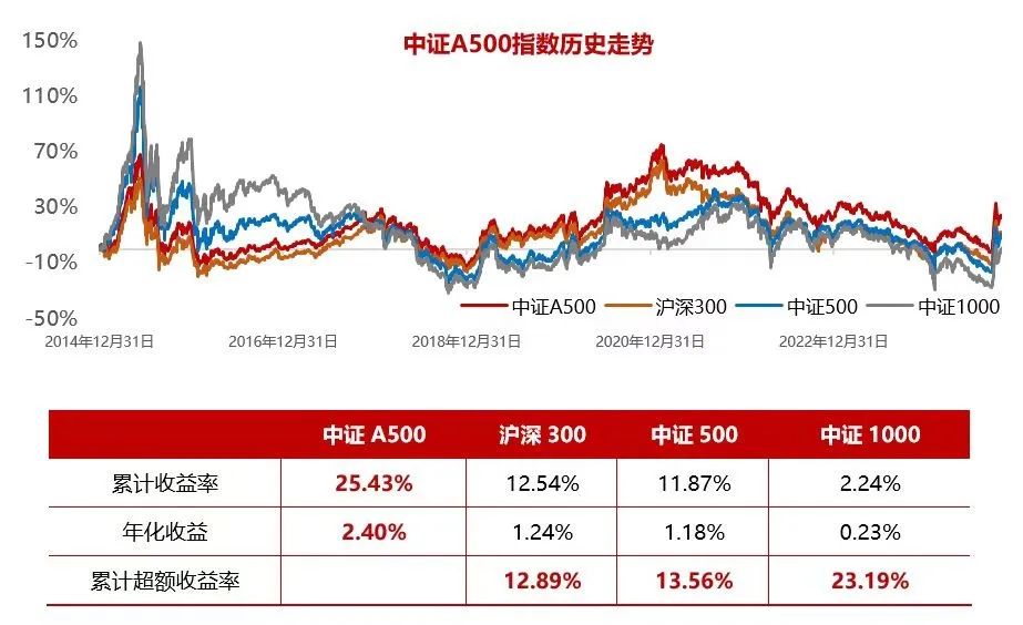 正因中证A500指数更加侧重于新兴产业,相较于沪深300、中证500等A股主要指数,其历史回测收益明显占优。中证A500指数自2014年12月31日以来近十年累计收益25.43%、年化收益2.40%,较同期沪深300指数超额收益分别达到12.89%、1.16%。