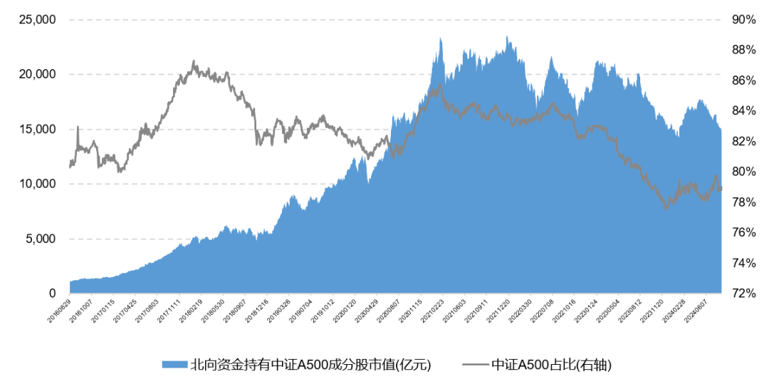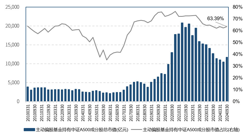 北向资金自开通以来持续加仓中证A500指数成分股,自2016年以来,持有中证A500指数成分股的市值占比均值达到82.59%;自2010年一季度以来,主动股基重仓股持有中证A500指数成分股的总市值整体呈现上升趋势,2021年一季度持股市值一度超过2万亿元。从占比来看,主动股基重仓股持有中证A500市值占比历史均值超过61.54%,最新占比63.39%。