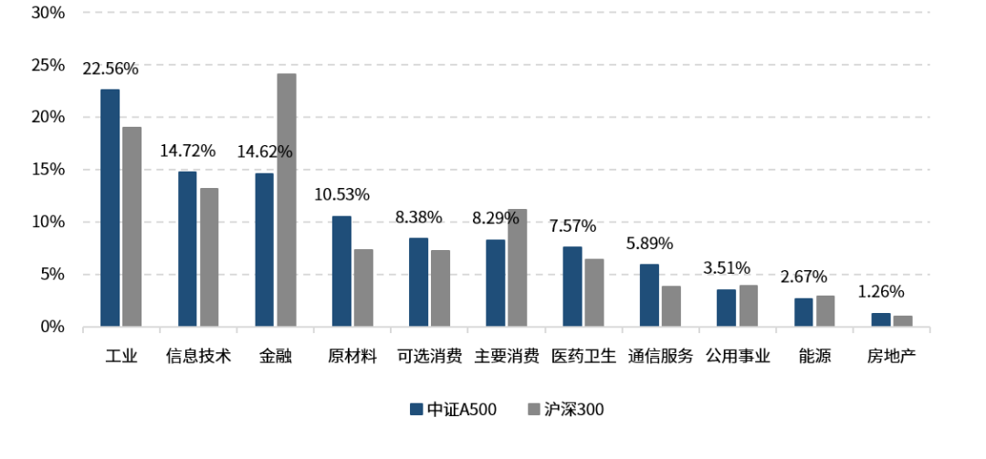 新质生产力代表更进步的中国,与过往的主流宽基相比,中证A500指数更加侧重信息技术、医药卫生等新兴行业。投资中证A500指数,与产业升级大潮同频共振。A500指数能够反映我国资本市场结构变化和产业转型升级,覆盖更多新质生产力行业。截至2024年11月1日,中证A500指数在工业、信息技术、原材料、医药卫生、通信服务等新兴行业权重高于沪深300,合计占比61.27%,而在金融、主要消费、能源、公用事业等传统行业的权重占比小于沪深300。