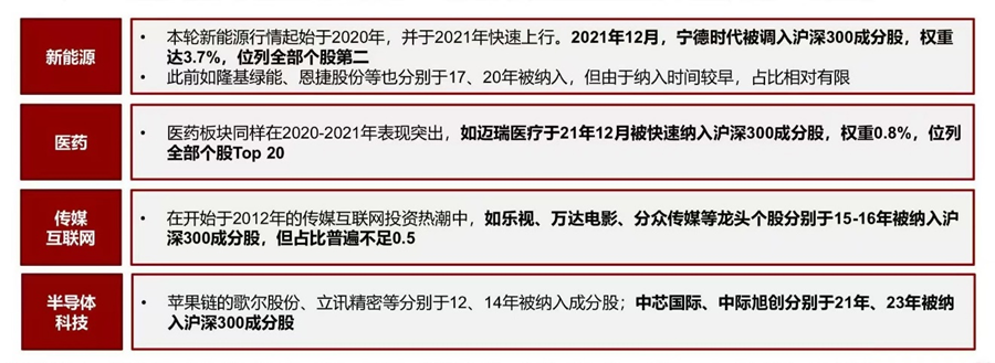 在各板块的主升行情中,均可以看到龙头个股被迅速纳入沪深300成分股,比如新能源主升潮中的宁德时代(300750),纳入后权重达3.7%,位列全部个股第二;医药行情中的迈瑞医疗(300760)、移动互联网浪潮中的乐视、万达电影(002739)、分众传媒(002027);以及近年来的中芯国际、中际旭创(300308)等。但以上案例均是在板块个股完成市值抬升后进入沪深300成分股,指数本身未完全反映个股涨幅。中证A500指数在编制方案时就考虑到了下沉细分行业挑选龙头,使得指数前瞻性引入具有成长性的行业龙头标的。除此之外,下沉至中证三级行业优选细分行业龙头股,不仅兼顾了一些市值相对较小、成长性更强的细分行业龙头股票,而且避免了对大市值个股扎堆行业的过大权重。