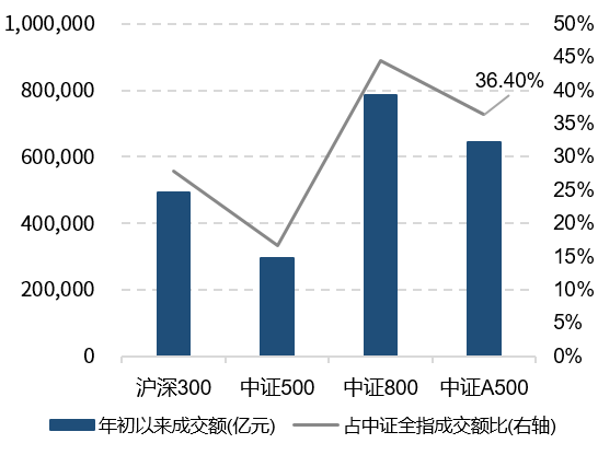 从流动性来看,中证A500交投活跃,流动性较好,以10%左右的股票数量贡献了A股超过1/3的成交额,今年以来占比36.40%。