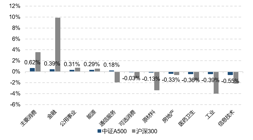 从各指数相对中证全指的行业偏离来看,中证A500在各中证一级行业上偏离均较小,最大偏离仅0.62%,行业的绝对偏离中位数和均值分别为0.33%、0.32%,远低于沪深300。