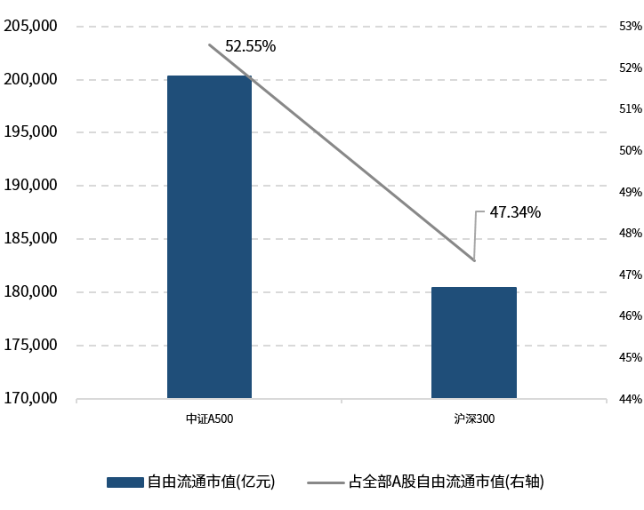 各项指数关键指标均能反映,中证A500指数是目前最能代表A股优质上市公司的指数之一,从中证A500指数里,你能窥见超全面的中国。从市值覆盖度来看,截至2024年11月1日,中证A500的自由流通市值超过20万亿元,占全部A股的自由流通市值比重为52.55%,高于沪深300,在市值上具备一定的代表性。市值分布上,中证A500成分股总市值中位数为392.30亿元,整体而言在偏向中大盘的同时,兼顾了一部分小盘股。