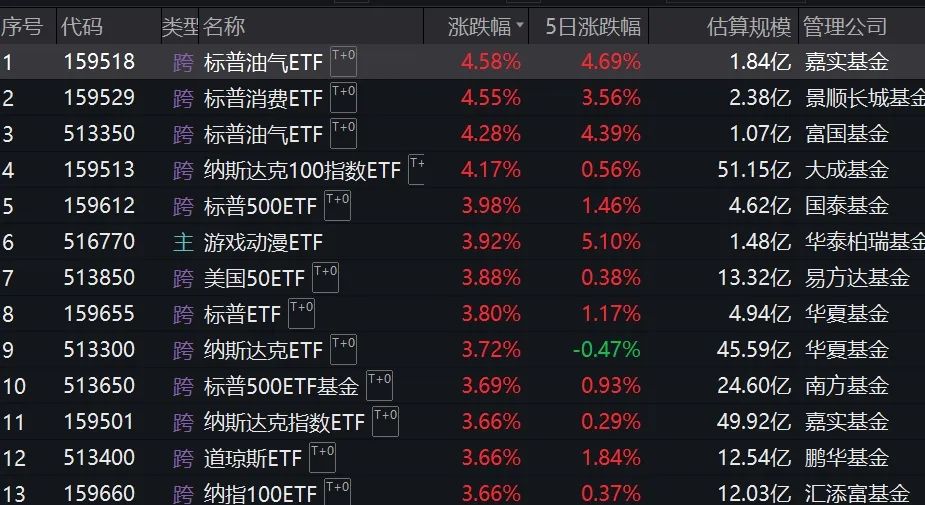 单只产品而言,标普油气ETF大涨4.58%领涨,标普消费ETF、标普油气ETF、纳斯达克100指数ETF均上涨4%以上。标普500ETF、美国50ETF、标普ETF、纳斯达克ETF等涨幅也在3%以上。同时,成交量亦有所放大。