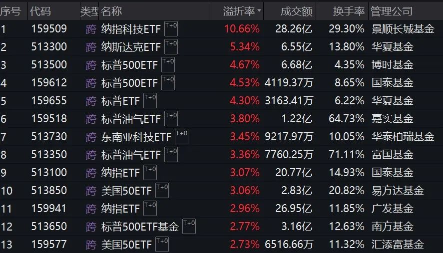 数据显示,当日收盘,纳指科技ETF上涨3.57%,溢价率高达10.66%,位居跨境ETF首位。