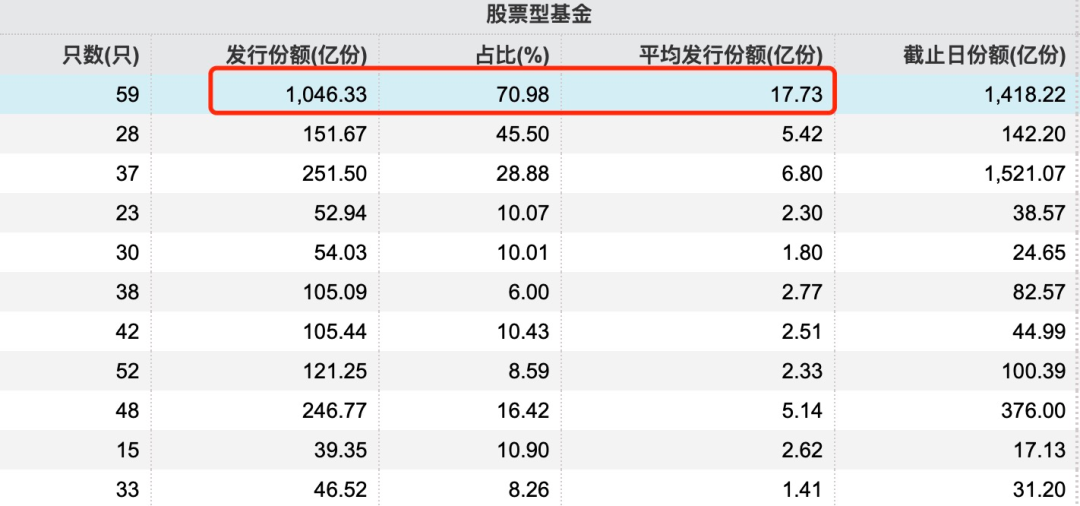从产品类型来看,11月股票型基金成立59只,发行份额为1046.33亿份,占比70.98%,平均发行份额17.73亿份。无论发行总份额、占比,还是平均发行份额均远高于年内其他月份。