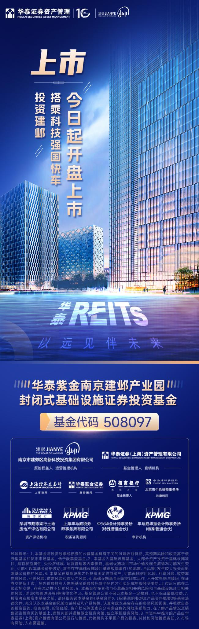 12月3日,由南京市建邺区高新科技投资集团有限公司(简称“建邺高投”)担任原始权益人和运营管理机构,由华泰证券旗下华泰证券(上海)资产管理有限公司(简称“华泰证券资管”)担任基金管理人和资产支持证券管理人的“华泰紫金南京建邺产业园封闭式基础设施证券投资基金”(简称“华泰南京建邺REIT”,代码:508097)在上海证券交易所正式上市。