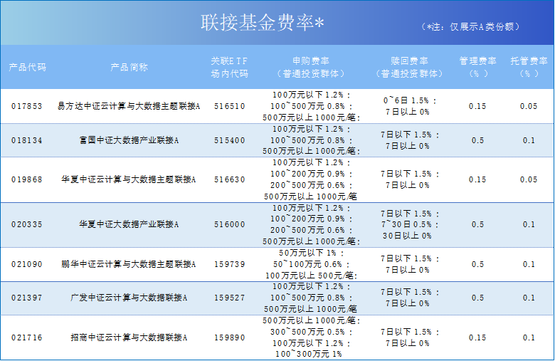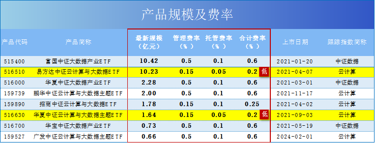 广发中证云计算与大数据主题ETF(159527)和华宝中证大数据产业ETF(516700)规模不足1亿元。华夏中证云计算与大数据主题ETF(516630)和招商中证云计算与大数据ETF(159890)规模不足2亿元。规模过小的ETF通常成交低迷,可能存在流动性风险,投资者需加以防范。