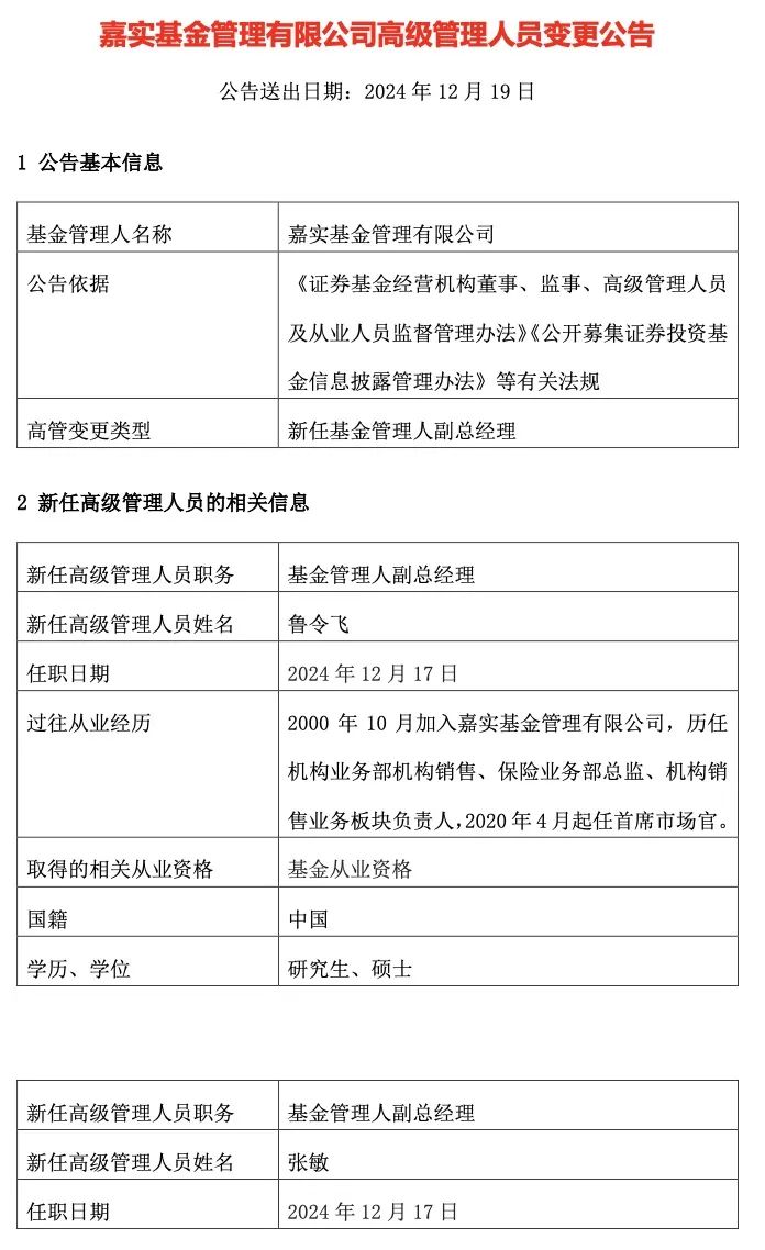 12月18日晚,嘉实基金发布高级管理人员变更公告,鲁令飞、张敏于12月17日升任公司副总经理。