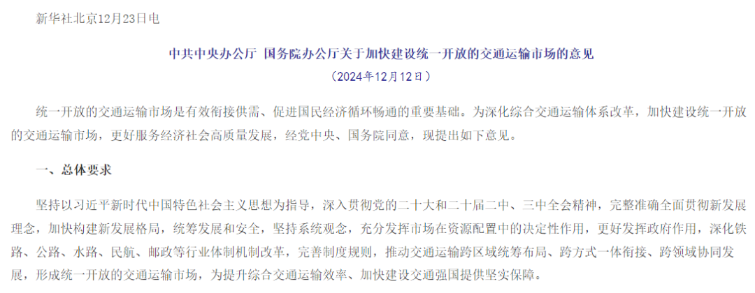 12月23日,中共中央办公厅、国务院办公厅发布关于加快建设统一开放的交通运输市场的意见。其中提出,优化交通运输市场要素资源配置。提升资金保障能力。鼓励各类金融机构、社会资本依法依规参与交通基础设施建设融资。支持符合条件的交通项目发行基础设施领域不动产投资信托基金(REITs),研究长期融资工具支持交通运输发展。