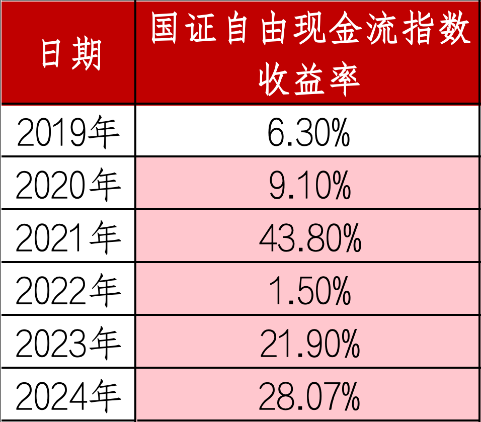 国证自由现金流指数的长期收益突出,2014年以来年化收益高达16%,显著高于300价值稳健、创价值、红利低波;年化波动低于创价值,高于300价值稳健和红利低波。2019年以来连续6年正收益,2021年以来连续4年表现占优,2024年全年取得28.07%的收益率。长期来看,随着未来A股市场中长线投资属性的资金占比不断提升,对于高现金流资产的配置需求也将不断加大。
