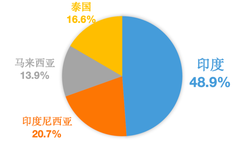 根据新加坡交易所数据,截至11月30日,该指数印度权重占比达48.9%,印度尼西亚、泰国、马来西亚权重占比分别为20.7%、16.6%、13.9%(按企业主营业务所在国家划分,指数成份及其权重将根据市场情况调整变化)。