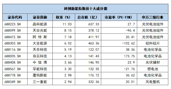 而上证科创板新能源指数(简称:科创新能;代码:000692.SH)便是立足于科创板市场,从中选取了50只市值较大的光伏、风电及新能源车等领域的上市公司证券作为指数样本。从成分股的行业分布来看,科创新能指数深入光伏电池组件、电池化学品、光伏辅材、锂电池、逆变器、硅料硅片等赛道,网罗新能源细分行业中的新兴力量。