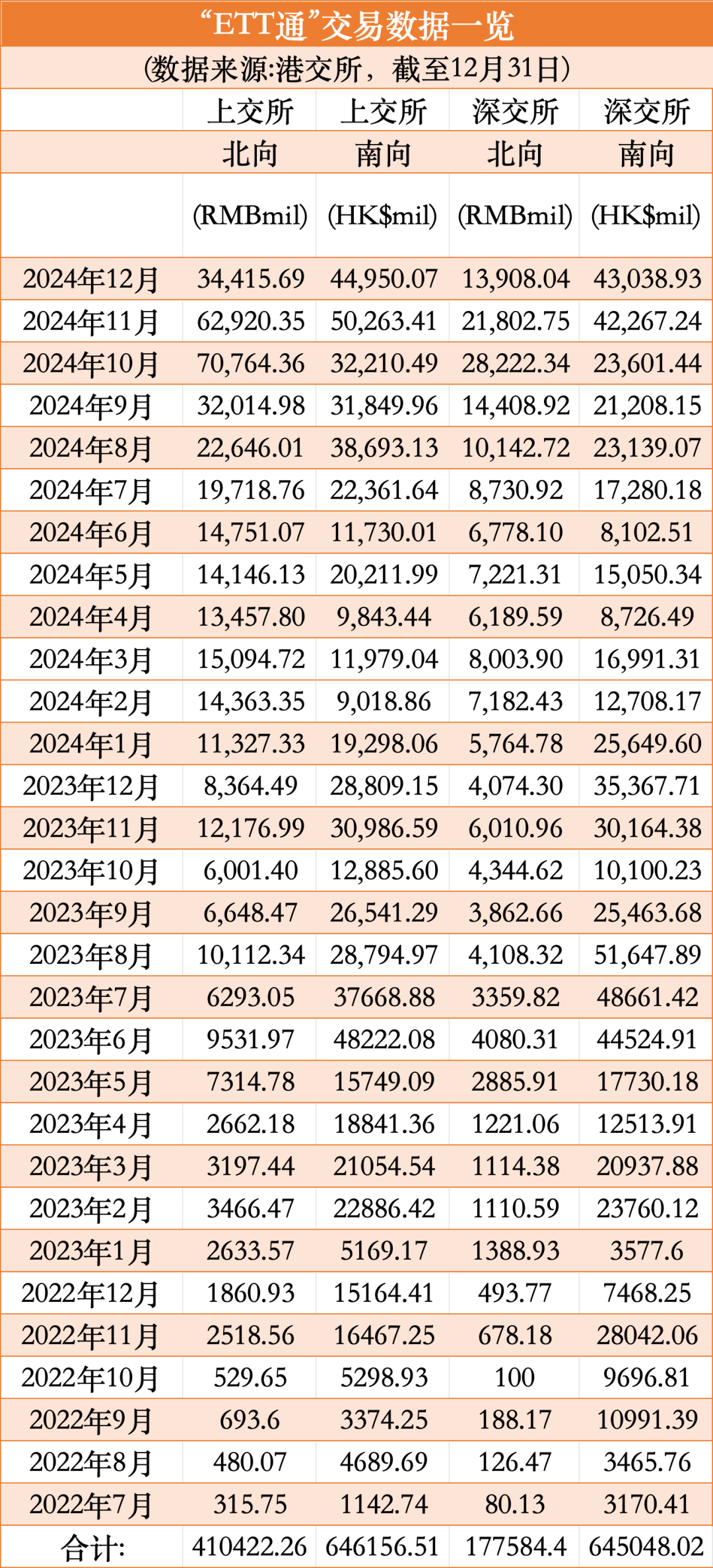 “ETF通”成交金额也显著扩大。沪股通9月成交金额提升至320.15亿元,环比增长41.37%;深股通9月成交金额达到144.09亿元,环比增长42.06%。到了10月份,随着增量资金涌入,沪股通成交金额迅速扩大至707.64亿元,环比增长超过121%;深股通成交金额增至282.22亿元,环比增幅也接近1倍。尽管到了12月,股市转为震荡,“ETF通”成交金额有所回落,但相比前一年的年末仍有数倍的增长。