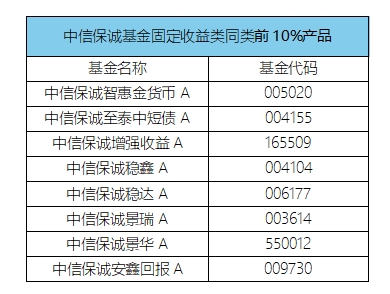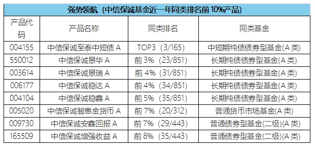 银河数据显示,近一年,共有8只固收产品强势领航,中短债方面,中信保诚至泰中短债A位列同类第3,长期纯债端,中信保诚景华A、中信保诚景瑞A、中信保诚稳达A、中信保诚稳鑫A均排名同类前5%。在以债打底、攻守兼备的债券基金层面,通过对股债投资的双向把控和跨部门基金经理之间的高效配合,中信保诚安鑫回报A近一年以9.58%的收益率排名同类前7%,中信保诚增强收益(LOF)以9.34%的收益位列同类前8%。.⑤