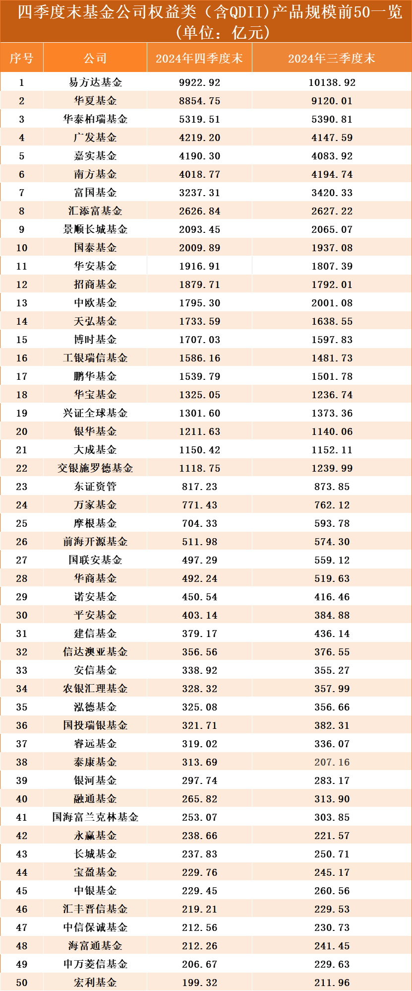 从权益类基金(含QDII)规模来看,排名前50的公司中,仅有19家去年四季度期间实现规模增长,占比38%。