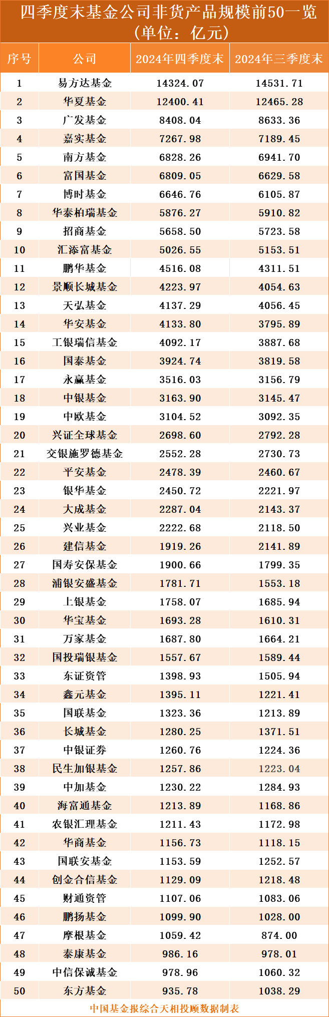 根据天相投顾数据,截至2024年四季度末,剔除货币基金后共有47家基金公司规模超过1000亿元,较三季度末减少一家。