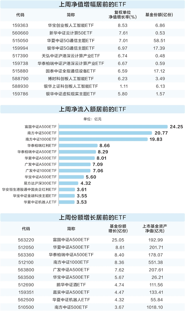 上周两大主题ETF表现亮眼 A500基金份额大增超80亿份