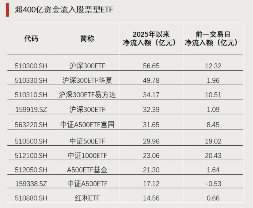 截至1月24日,2025年以来全部股票型ETF合计获445.11亿元资金净流入,沪深300ETF、中证500ETF、中证A500指数ETF等宽基指数ETF强势“吸金”。