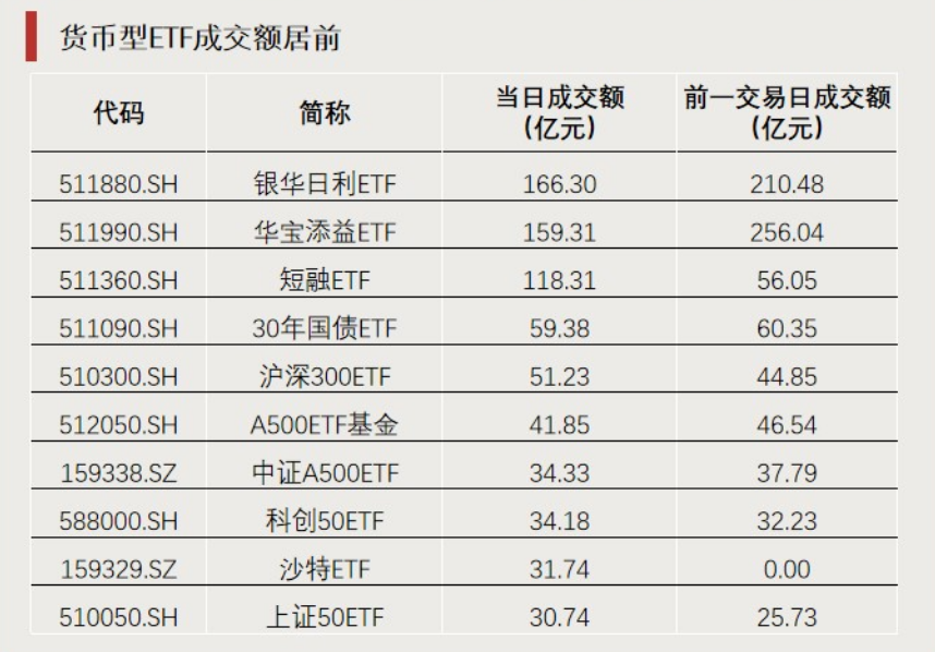1月27日,银华日利ETF、华宝添益ETF、短融ETF当日成交额均突破100亿元,30年国债ETF成交额接近60亿元。股票型ETF方面,沪深300ETF、A500ETF基金、中证A500ETF当日成交额居前。