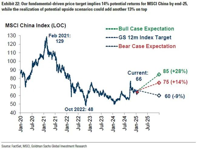 高盛在最新研报中表示,在中性预期下,MSCI中国指数今年有14%的涨幅,从目前的66点升至75点;乐观预期下,该涨幅有望达到28%。