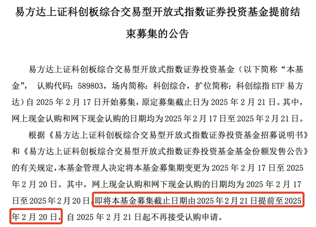 易方达基金也在当日晚间发布公告表示,旗下科创综指ETF募集期变更为2月17日至 2月20日。其中,网上现金认购和网下现金认购的日期均为2月17日至2月20日,自2月21日起不再接受认购申请。