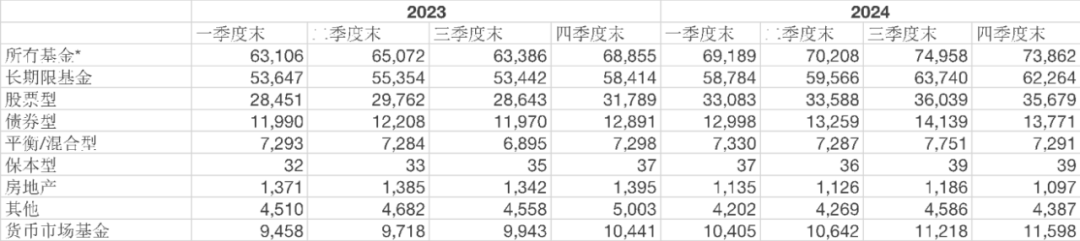 资金流入方面:2024年四季度,股票型基金获资金净流入3680亿美元,2024年3季度这一数值为2380亿美元。同期,债券型基金获资金净流入3150亿美元,2024年3季度这一数值为2440亿美元。平衡/混合型基金遭遇资金净流出460亿美元,2024年3季度该类型获净流入430亿美元。货币市场基金获资金净流入5820亿美元,2024年3季度这一数值为4030亿美元。