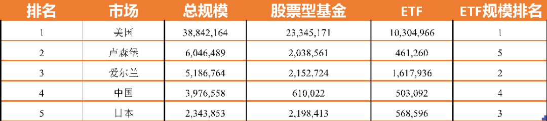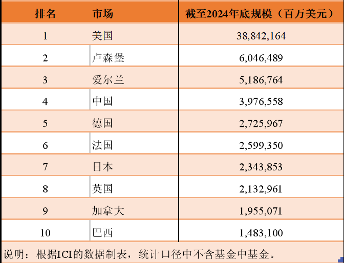 中国坐稳全球第4的位置,若剔除卢森堡和爱尔兰两大离岸中心,中国是仅次于美国的在岸基金市场。