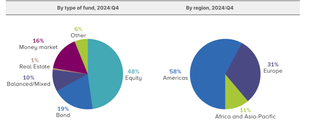 基金资产分布方面:截至2024年四季度末,股票型基金规模占比48%、债券型基金占比为19%、平衡/混合型基金占比为10%、货币市场基金占比为16%。地区分布方面:美洲占比为58%、欧洲占比为31%、非洲与亚太占比为11%。