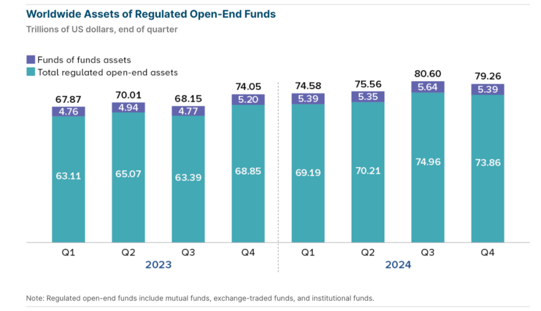 ICI代表国际投资基金业协会(IIFA)汇编全球受监管开放式基金数据。2024年四季度的统计涵盖44个司法管辖区。按照ICI的统计口径:受监管开放式基金包括公募基金、交易所交易基金(ETF)及机构基金。