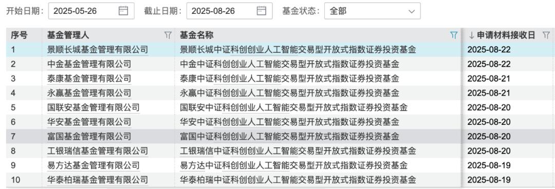 值得一提的是,8月19日至8月22日,10家公募基金集中上报首批中证科创创业人工智能ETF。这批ETF跟踪的是中证科创创业人工智能指数(932456),该指数于今年5月发布,最新前三大成分股为新易盛(300502)、中际旭创(300308)、寒武纪。这意味着,AI板块更多被动投资资金还在路上。