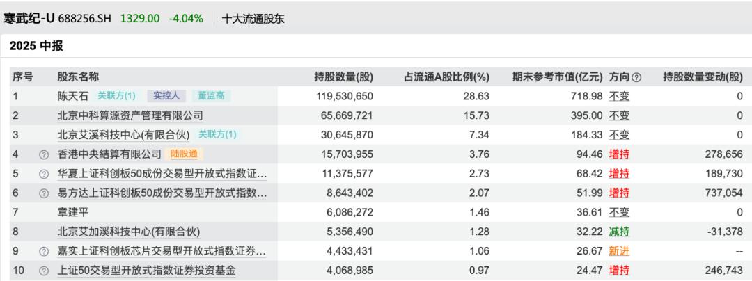 寒武纪半年报披露,截至今年6月末,在寒武纪前十大流通股东名单中,4个席位属于ETF。其中,华夏上证科创板50ETF和易方达上证科创板50ETF分别位列第5位和第6位,持股数量较一季度末均有所增长;第9位是新进入榜单的嘉实上证科创板芯片ETF,持股约443万股;华夏上证50ETF位列第10位,持股约407万股,较一季度末有所增长。